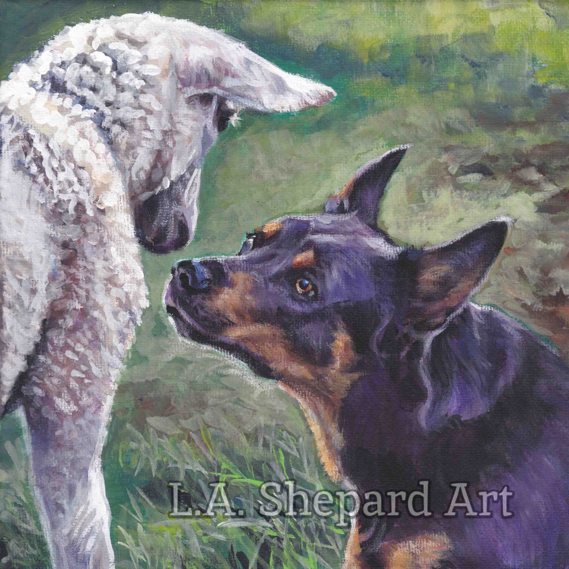 AUSTRALIAN KELPIE and sheep canvas PRINT of LAShepard painting dog art 8x8