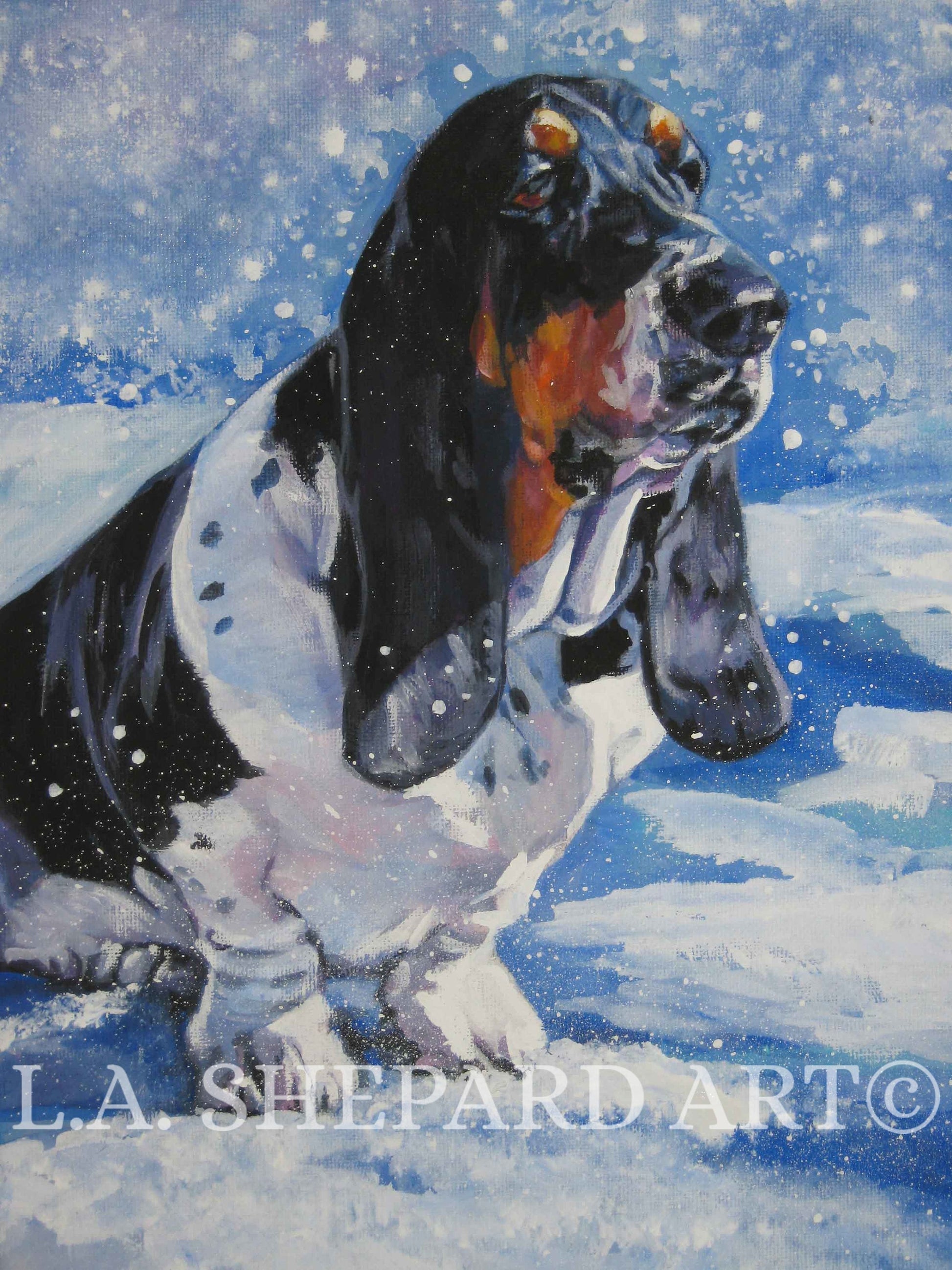 BASSET HOUND dog portrait art PRINT of LAShepard painting 8x10 xmas snow