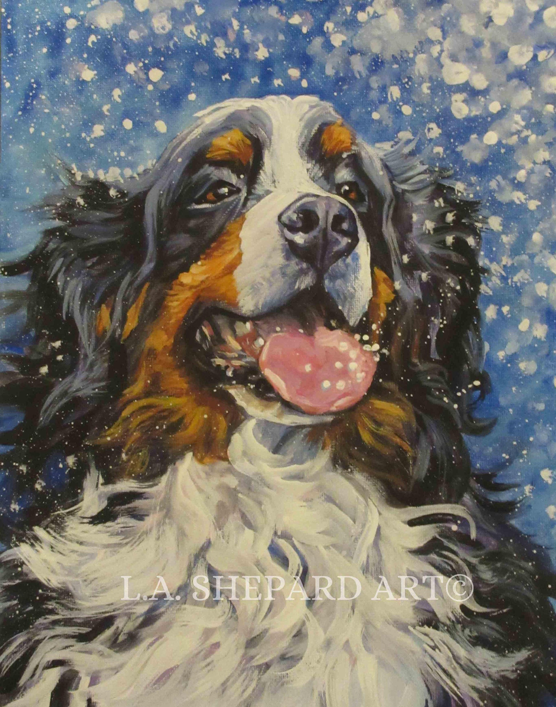 Bernese Mountain Dog BERNER PORTAIT art print of LAShepard painting 8x10" BMD xmas winter snow