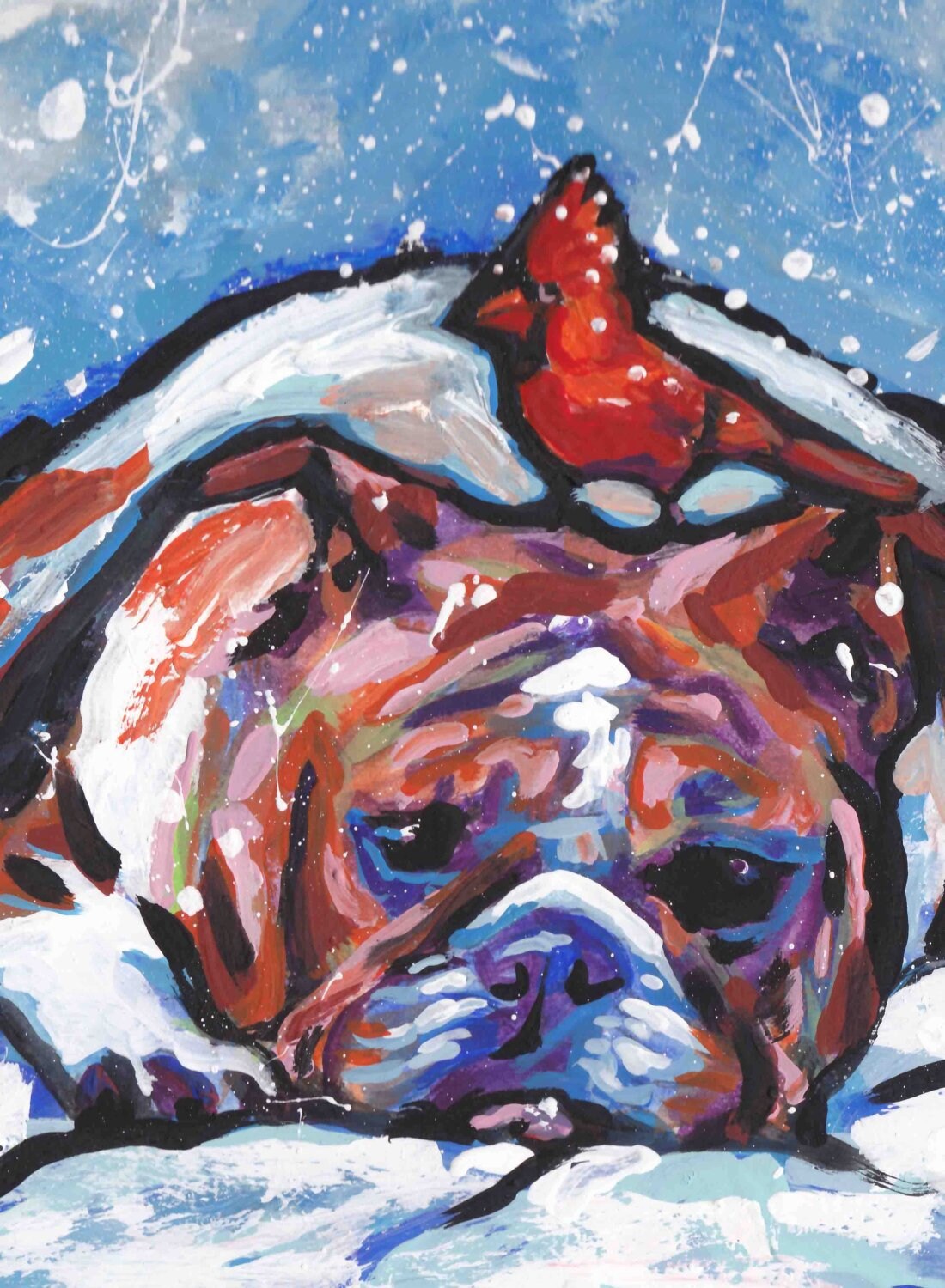 Bulldog and Cardinal winter Dog and cardinal art print of modern pop art painting 13x19