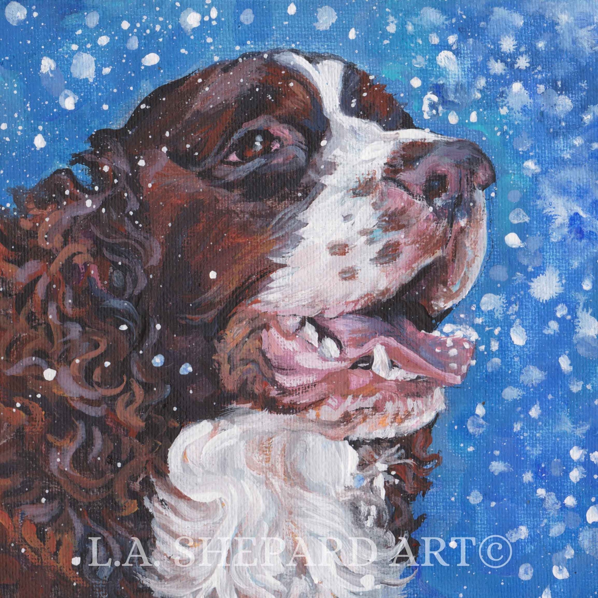 English SPRINGER SPANIEL dog portrait art canvas PRINT of LAShepard painting 12x12" holiday art