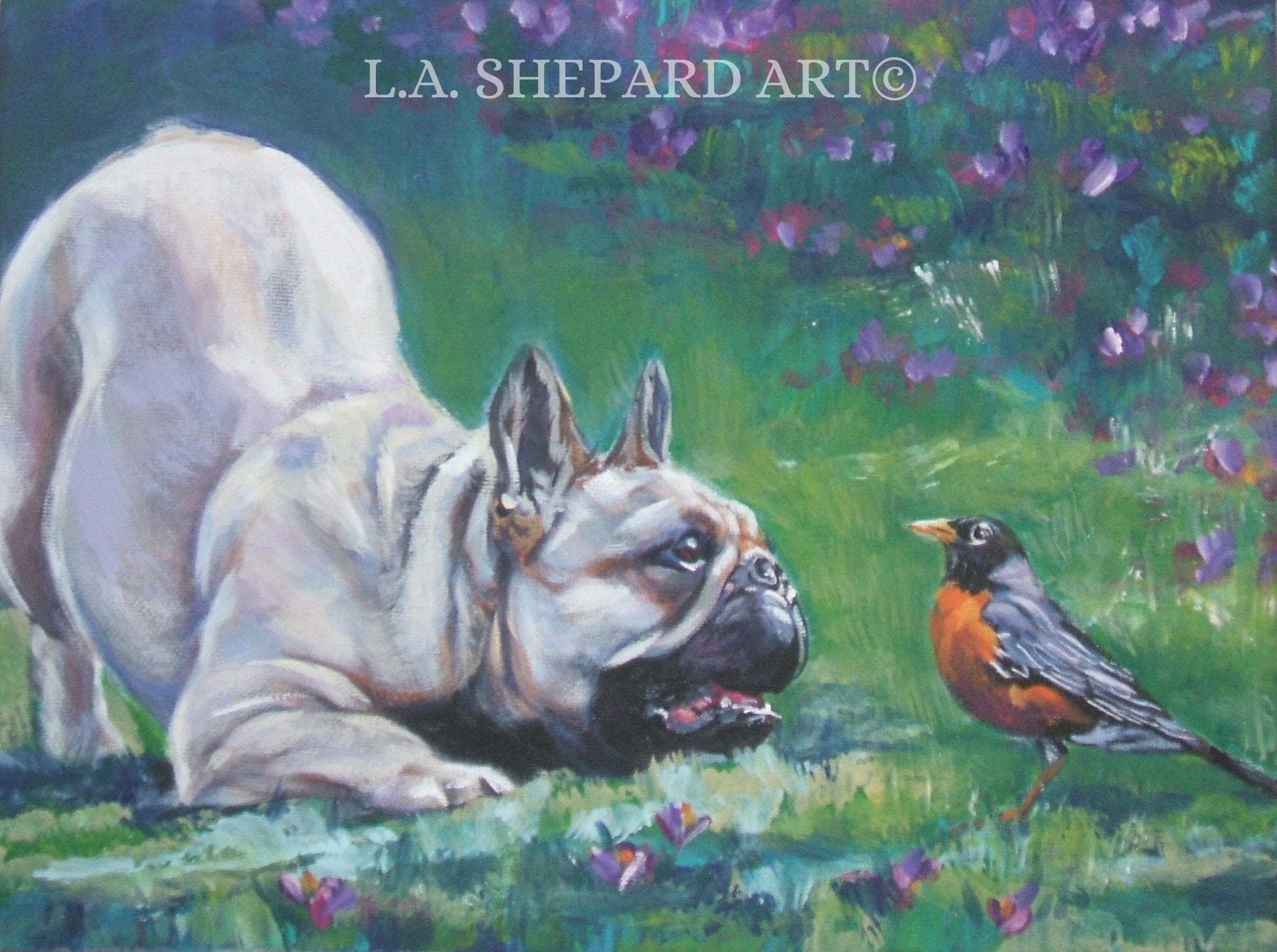 Copyright text is for display purposes only and will not appear on your artwork 12 x 16 inch French Bulldog flat GICLEE print by L.A.Shepard ABOUT THE PRINT: This open edition image measures 12x16 inches and is printed on 13"x19" FLAT CANVAS SHEET with archival inks. I use a specially designed CANVAS for archival fine art prints. Your Giclee print will come on a very high quality flat Canvas sheet, looking like the original painting, and can be framed easily in a standard frame with a backing, with or without glass. Print is hand signed by the artist on the front border. Would you like to see more of my work? Please click the link below to browse through my store- http://www.etsy.com/shop/TheDogLover?ref=ss_profile About the Artist: I have been a full time artist, specializing in animal portraiture, since my husband was diagnosed with brain cancer in July 2006. I was blessed to have been able to stay at home, painting the things I love, and care for my husband at the same time. We were so blessed as we had another four and a half years together. But on September 26, 2010, my incredible husband, Gary, lost his battle. My husband was always my inspiration as well as my most positive encourager. At first, I painted to pay the bills, but it became my passion very quickly. This is the legacy he left me. He was very proud of me, and though my art career was forged from tragedy, it is certainly the silver lining that he left me with. My work has been collected around the world, from Australia , Europe and the U.S. to right here at home, in beautiful Canada. My dogs have gotten me through some very tough times, and I try to capture the essence of these incredible friends and healers in each piece I create.