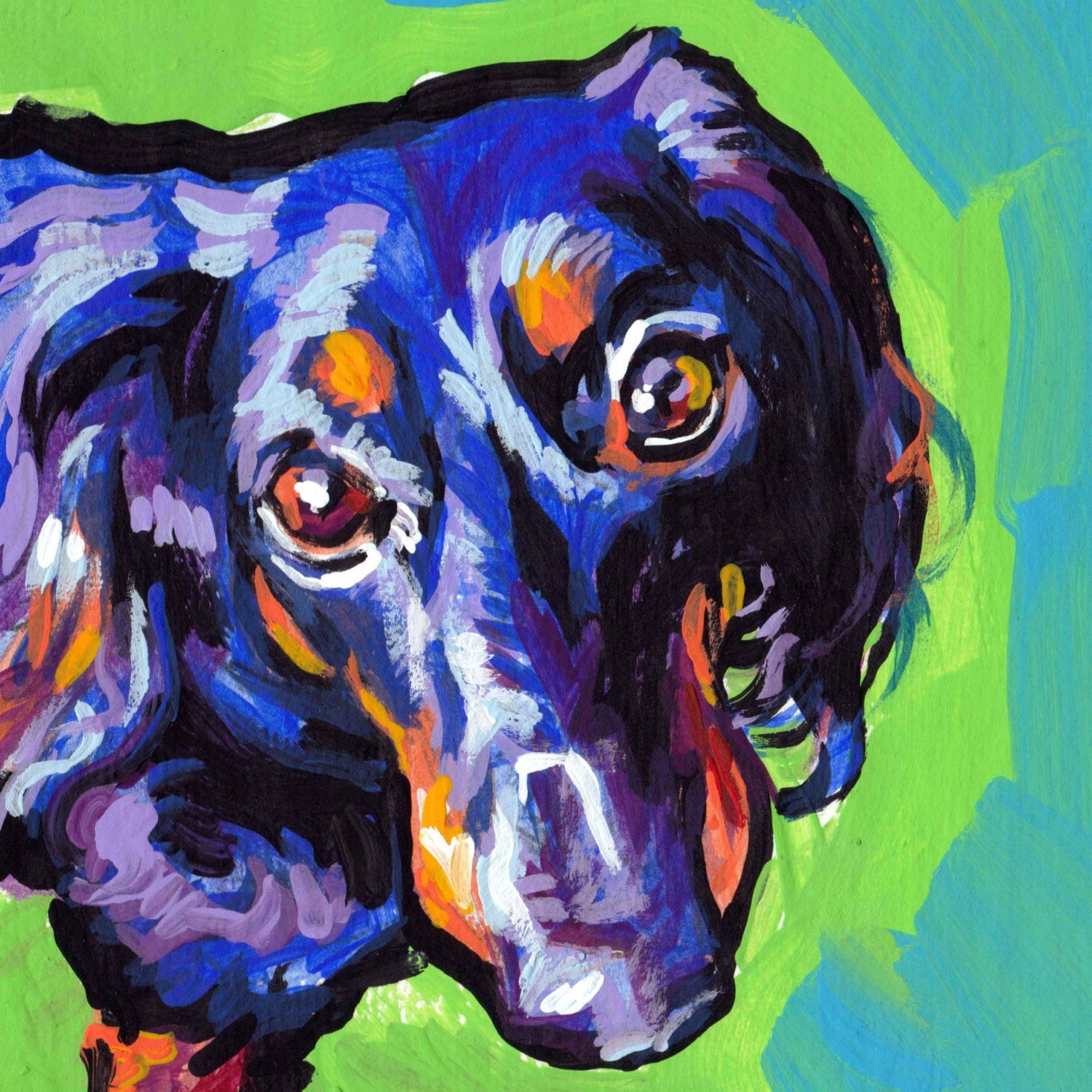 long haired black and tan Dachshund portrait art print of pop art painting bright colors 8x8