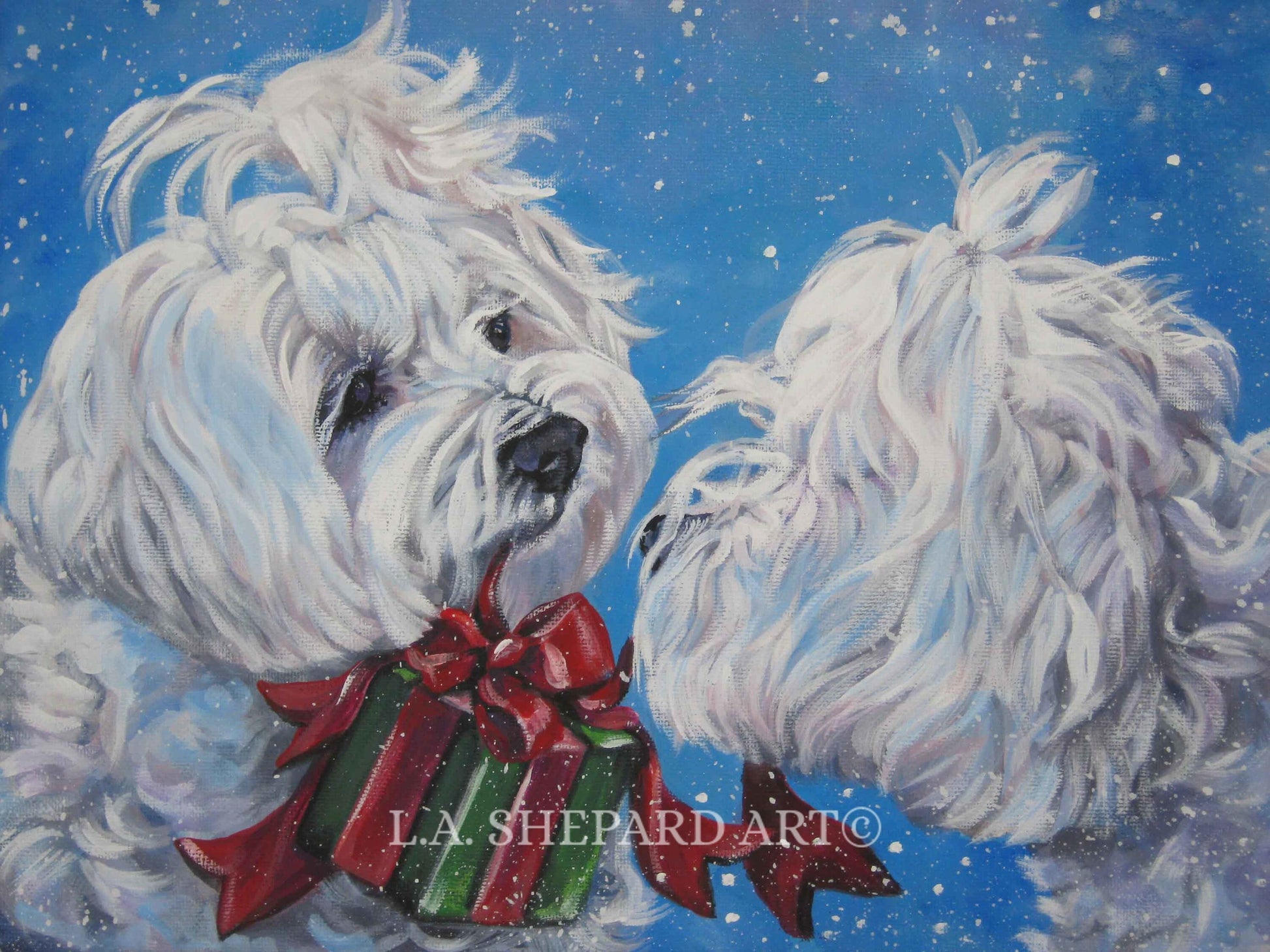 MALTESE dog christmas art PRINT of LA Shepard painting 8x10