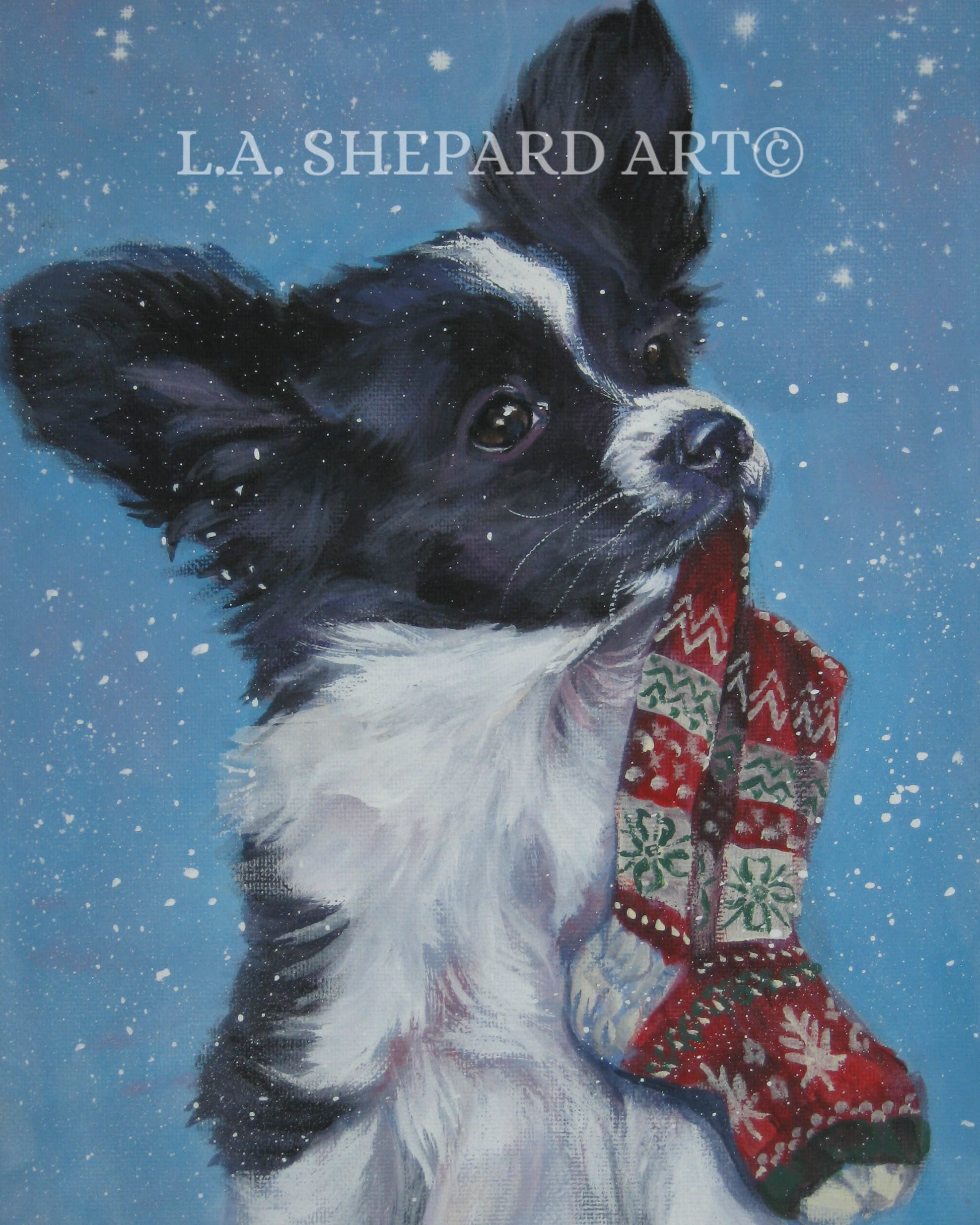 PAPILLON dog portrait ART PRINT of LAShepard painting 8x10 xmas snow