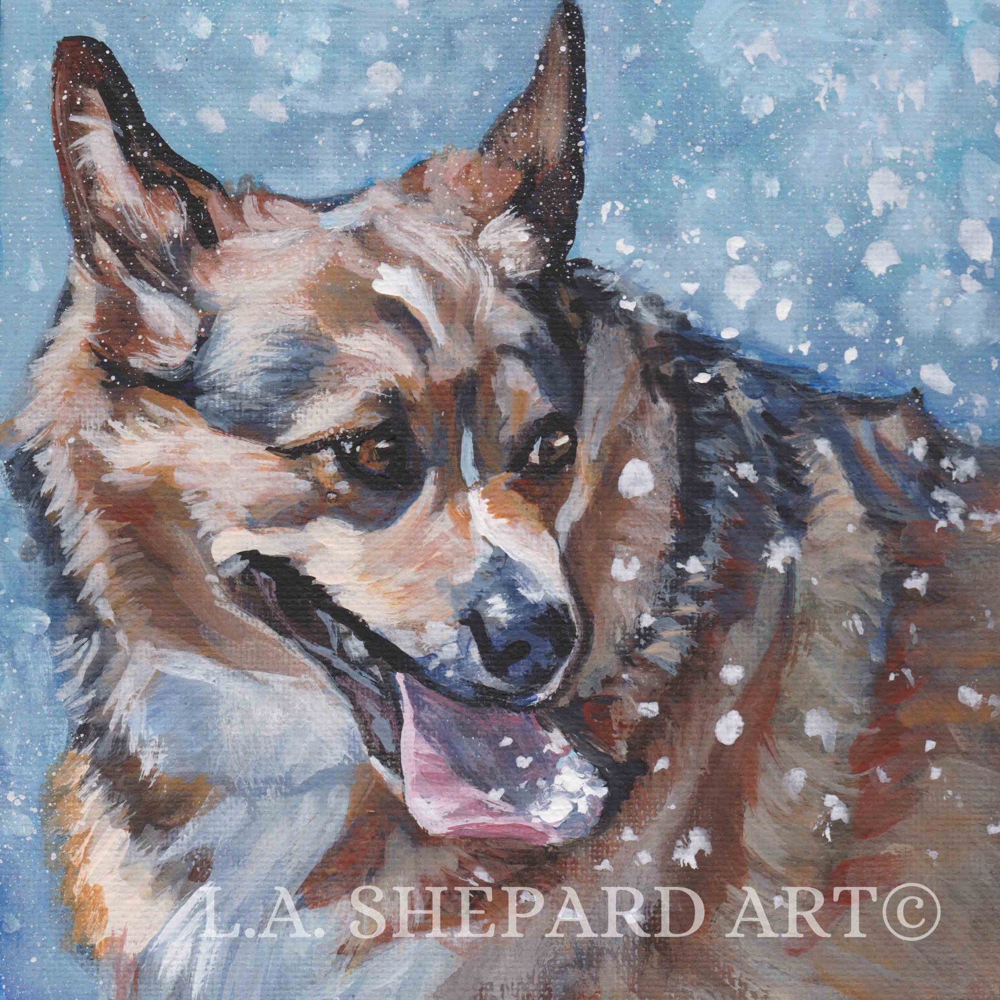 Pembroke Welsh CORGI PORTRAIT Canvas PRINT of LAShepard painting 8x8" dog art winter xmas snow