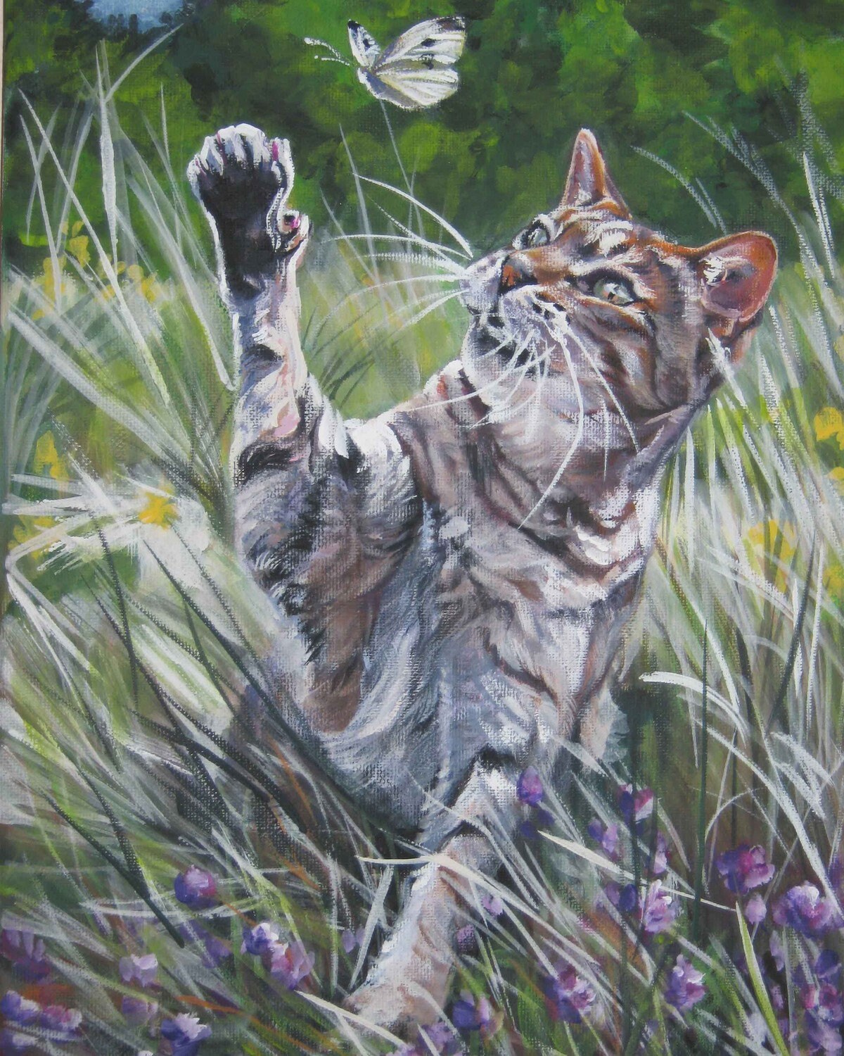TABBY CAT art canvas PRINT of LAShepard painting 8x10" kitty and butterfly